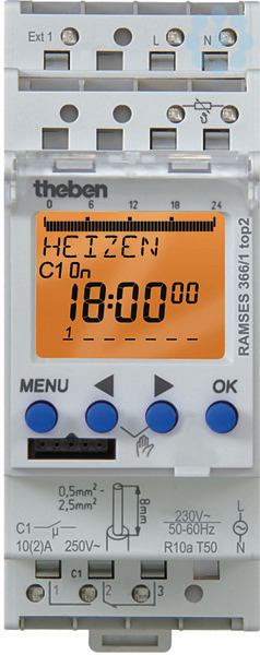 Reiheneinbau-Zonenregelung (1 Zone), Breite 2 TE, Uhrenthermostat zur Ferntemperaturregelung, Tag-und Nachttemperatur einstellbar, Temperaturprofil für Normal-und Absenktemperatur mit Tages-, und Wochen-und Ferienprogramm wählbar, Bedienerführung durch integrierte Textzeile in der LCD-Anzeige, automatische Sommer-/Winterzeitumstellung, Schnittstelle für OBELISK top2 Speicherkarte