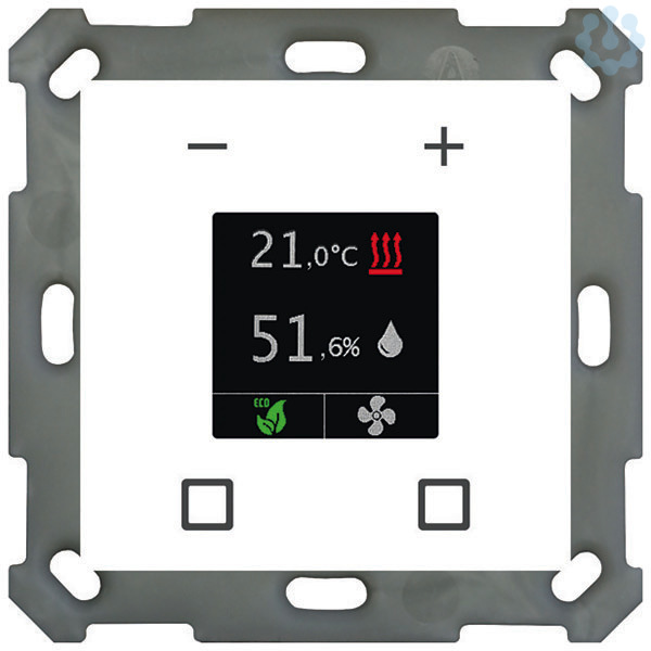 Temperatur- und Feuchtesensor. Montage in Schalterdose. Integrierter Busankoppler. Passend für 55mm Schalterprogramme z.B.: GIRA Standard 55, E2,E22, Event, Esprit, BERKER S1, B3, B7, JUNG A 500, A PLUS, A CREATION, AS 500, A 550, A FLOW, MERTEN 1M, M-Smart, M-Plan, M-Pure. Aktives Farbdisplay zur Funktions- und Statusanzeige. Hintergrundfarbe w/s und Displayhelligkeit einstellbar. Anzeige von Soll- und Isttemperatur. Raumtemperatur-Nebenstelle für Innenräume. Messbereich -10 bis +50°C. Einfache Sollwertverschiebung über separate +/- Tasten. 1Bit +/-, 1Byte oder 2Byte Absolutobjekt zur Sollwertverstellung. Grenzwerte Min/Max, Min/Max Speicher. Raumtemperaturregelung im Zusammenspiel mit den MDT AKH-Heizungsaktoren.