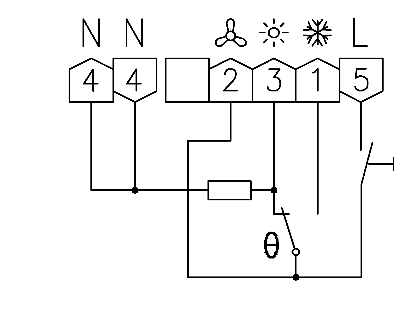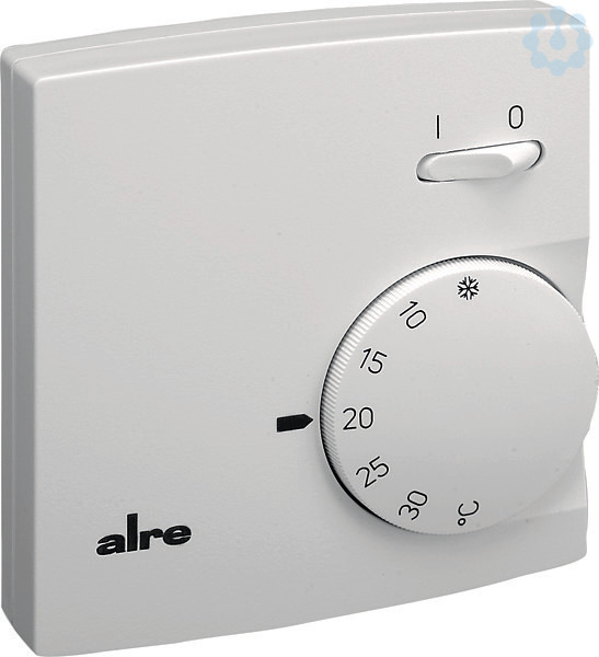Elektromechanischer Raumtemperaturregler im Aufputzgehäuse zur Regelung oder Überwachung von Temperaturen in Büros, Wohnräumen und Hotels. Geeignet für alle Heizungsarten. Durch die thermische Rückführung wird eine sehr genaue Schaltdifferenz erreicht. Mit der unter dem Einstellknopf befindlichen Bereichseinengung kann der Einstellbereich verändert werden. Das Gerät verfügt über einen Schalter EIN/AUS. Der Ventilatorausgang ist dauerhaft mit 230 VAC geschaltet, wenn das Gerät eingeschaltet ist. Das Gerät wird mittels Aufputz- / Wandmontage (4-Loch-Befestigung auf UP-Dose) montiert. Schaltleistung Heizen (Klemme 3) 2300 W, Kühlen (Klemme 1) 1150 W, Ventilator (Klemme 2) 1150 W.
