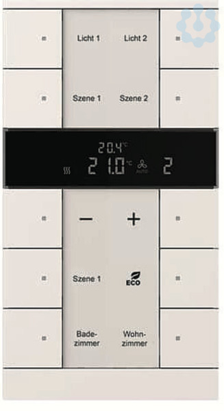 Frei konfigurierbares Multifunktionsbedienelement. Mit integriertem KNX-Busankoppler. Mit Beschriftungsfeld. Unterstützung der KNX-Funktionen durch innovatives Farbkonzept (gelb=Beleuchtung, blau=Jalousie, orange=RTR, magenta=Szene und weiß=neutral/keine Funktionszuordnung) oder Standardbeleuchtung rot/grün. Tasterfunktion: Schalten / Dimmen / Jalousie /Wert senden / Lichtszenen u.a. Master-/Slavebetrieb. Mit Grundlastbetrieb. Der Regler ist ein stetiger Raumtemperaturregler für Ventilator-Konvektoren (Fan Coil) in 2- und 4-Rohr Anlagen und konventionellen Heiz- oder Kühlanlagen Die Lüfterstufe kann manuell oder in den Automatikbetrieb geschaltet werden Klasse des Temperaturreglers: 1 Beitrag zur Raumheizungsenergieeffizienz: 1,0%. Anzahl Busteilnehmer: 1 Bei Bedarf entnehmen Sie bitte die programmierbaren Funktionen aus der aktuellen Applikationsbeschreibung die Sie von unserer Internetseite www -jaeger.de herunterladen können. Passende Beschriftungssoftware unter www.BUSCH-JAEGER-Beschriftungstool.de.