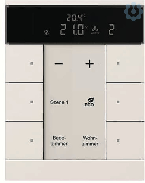 Frei konfigurierbares Multifunktionsbedienelement. Mit integriertem KNX-Busankoppler. Mit Beschriftungsfeld. Unterstützung der KNX-Funktionen durch innovatives Farbkonzept (gelb=Beleuchtung, blau=Jalousie, orange=RTR, magenta=Szene und weiß=neutral/keine Funktionszuordnung) oder Standardbeleuchtung rot/grün. Tasterfunktion: Schalten / Dimmen / Jalousie /Wert senden / Lichtszenen u.a. Zur Ansteuerung von Heizungs-, Lüftungs- und FanCoil-Aktoren. Master-/Slavebetrieb. Mit Grundlastbetrieb. Die Lüfterstufe kann manuell oder in den Automatikbetrieb geschaltet werden Klasse des Temperaturreglers: 1 Beitrag zur Raumheizungsenergieeffizienz: 1,0%. Anzahl Busteilnehmer: 1 Bei Bedarf entnehmen Sie bitte die programmierbaren Funktionen aus der aktuellen Applikationsbeschreibung die Sie von unserer Internetseite www -jaeger.de herunterladen können. Passende Beschriftungssoftware unter www.BUSCH-JAEGER-Beschriftungstool.de.