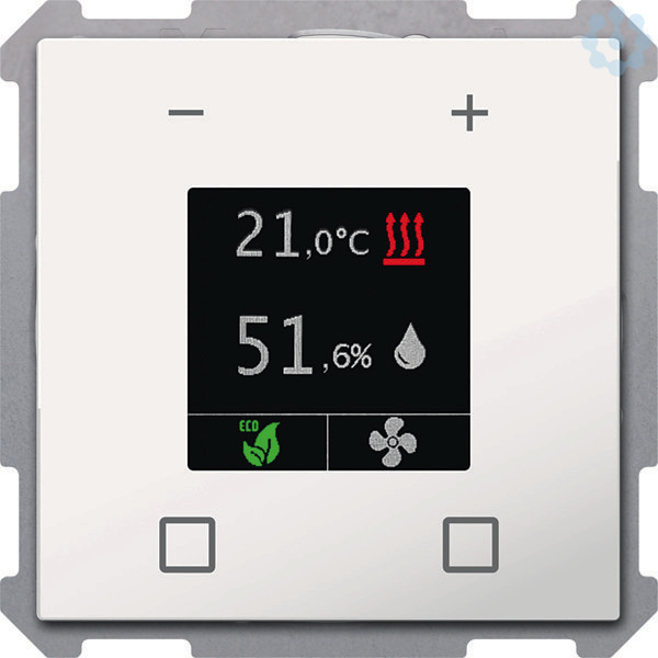 Raumtemperaturregler Smart 63, Studioweiß glänzend. Mit Farbdisplay, Temperatur-/Feuchtesensor und 4 Eingängen. Montage in Schalterdose. Integrierter Busankoppler. Passend für 63mm Schalterprogramme, z.B. Busch-Jaeger future linear, solo, carat und Busch-axcent. Aktives Farbdisplay zur Funktions- und Statusanzeige. Hintergrundfarbe w/s und Displayhelligkeit einstellbar. Anzeige von Soll- und Isttemperatur. Raumtemperaturregler für Innenräume. Messbereich -10 bis +50°C. Reglertyp (2-Punkt, PI, PWM) auswählbar. Einfache Sollwertverschiebung über separate +/- Tasten. 1Bit +/-, 1Byte oder 2Byte Absolutobjekt zur Sollwertverstellung. Speicherung der Sollwerte bei Busspannungsausfall. Grenzwerte Min/Max, Frostalarm, Min/Max Speicher. Umschaltung der Betriebsart über Bit/Byte Objekte. Temperatur- und Feuchtesensor mit Berechnung des Taupunktes. Meldung beim Verlassen des Behaglichkeitsbereiches. 4 Binäreingänge zum Anschließen von potentialfreien Kontakten (Taster, Schalter, Fensterkontakte). Lüftungssteuerung mit H