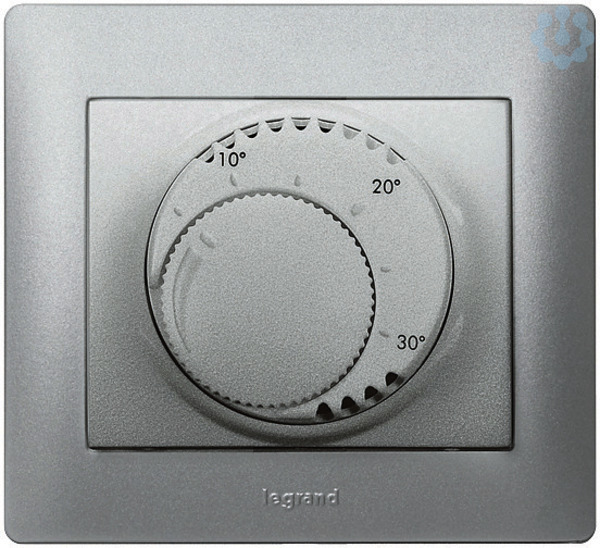 Bimetallthermostat mit thermischer Rückführung. Temperaturbereich: +5 bis +30°, Bereichseinengung im Einstellknopf möglich, Schaltausgang: 1 Wechsler, Schaltstrom: 5 A bei cos= 1, 2 A bei cos= 0,6. Farbe: Soft Aluminium