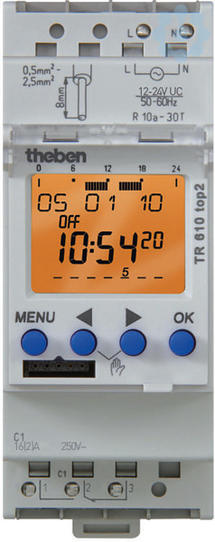 Digitale Zeitschaltuhr für DIN-Schiene, textorientierte Bedienerführung im Display, Breite 2 TE, Gangreserve und programmierte Sommer-/Winterzeitumstellung, Tages-und Wochenprogramm, DuoFix Steckklemmen, OBELISK-Schnittstelle für PC-Programmierung, 1 Kanal