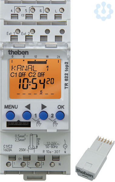 Digitale Zeitschaltuhr für DIN-Schiene, externe Eingänge, textorientierte Bedienerführung im Display, Breite 2 TE, Gangreserve und programmierte Sommer-/Winterzeitumstellung, Tages-und Wochenprogramm, DuoFix Steckklemmen, OBELISK-Schnittstelle für PC-Programmierung, Speicherkarte inklusive, 2 Kanäle