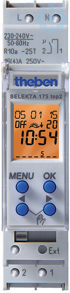Digitale Astro-Zeitschaltuhr für DIN-Schiene, astronomisches Programm schaltet bei Sonnenauf-und Sonnenuntergang, Datenbank mit Städtenamen, textorientierte Bedienerführung im Display, Breite 1 TE, Gangreserve und programmierte Sommer-/Winterzeitumstellung, Tages-und Wochenprogramm, DuoFix Steckklemmen, OBELISK-Schnittstelle für PC-Programmierung, 1 Kanal