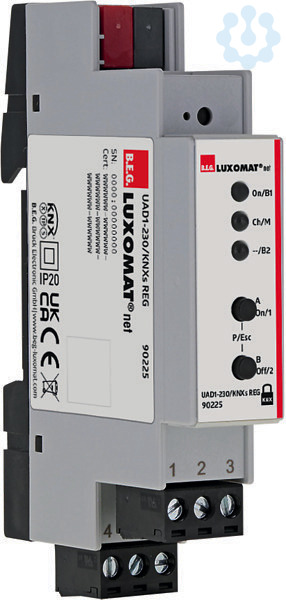 Universaler Dimmaktor und Schaltaktor (1-Kanal), Ventilaktor mit Pulsweitenmodulation (PWM) für thermische Stellantriebe, KNX Secure fähig, KNX-Reiheneinbaugerät zur Montage auf einer Hutschiene (TH 35 nach EN 60715) zum Einbau in den Verteiler, Binäreingänge 230V (2x), geräuschloser Halbleiter-Ausgang 230V, umfangreiche Dimmfunktionen, Dimmen mit Phasenanschnitt- oder Phasenabschnittssteuerung, Szenen- und Sequenzfunktion, Treppenhaus-, Timer- und Zählerfunktionen, Sperrfunktionen, diverse Überwachungsfunktionen, 16 Logikfunktionen und Zeitfunktionen, Vor Ort-/Handbedienung, Spannungsversorgung über KNX-Bus, Anschluss der Eingänge und Ausgänge über Schraubklemmen, Parametrierung ab ETS 5 zur Integration in KNX-Systeme, Die Produktdatenbank kann von der B.E.G.-Homepage heruntergeladen oder vom ETS-Onlinekatalog direkt importiert werden