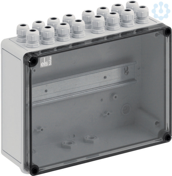 Reihenklemmengehäuse RK-PV 8-L, PV Reihenklemmengehäuse (leer), mit Normschiene NS 35, mit Kabelverschraubungen, M16, beiliegend, Dichtbereich 4 - 10 mm, mit Isolierstopfen, Schutzart IP66, Schlagfestigkeit IK08, Schutzklasse II, Halogenfrei, 254 x 180 x 90