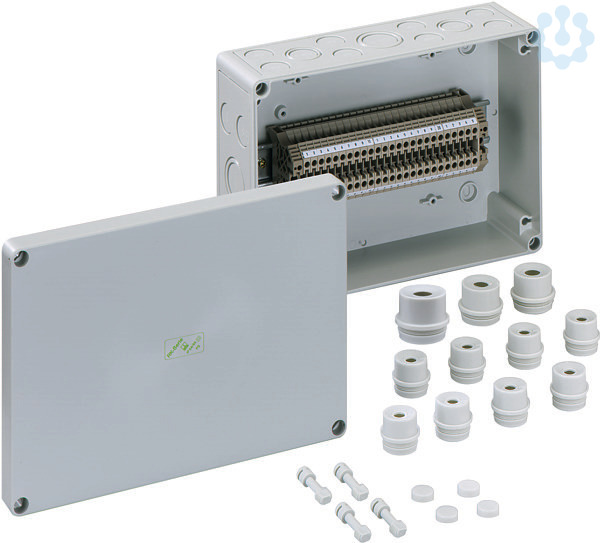 Reihenklemmengehäuse, Polycarbonat, grau ähnlich RAL 7035, inkl. 8 Anbaustutzen M20, Dichtbereich 8-13,5mm, IP54, 2 Anbaustutzen M25, Dichtbereich 9-18,5mm, IP54, 1 Anbaustutzen M32, Dichtbereich 13-23mm, IP54, bestückt mit 25 Schraubklemmen 4qmm, (Typ Weidmüller WDU 4)