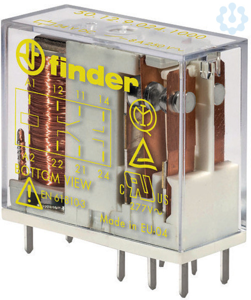 Printrelais mit zwangsgeführten Kontakten nach EN 61810-3, Typ B, 2 Wechsler für 8 A, Kontaktpinraster 5 mm, Kontaktmaterial AgNi, Versorgungsspannung 48 V DC, Spulenwiderstand 3280 Ohm, Spulenleistung 0,7 W, Relaisschutzart RT II, nach EN 61810-3 (Typ B) dürfen als zwangsgeführte Kontakte nur ein Öffner und ein Schließer (11-12 und 21-24 oder 21-22 und 11-14) genutzt werden