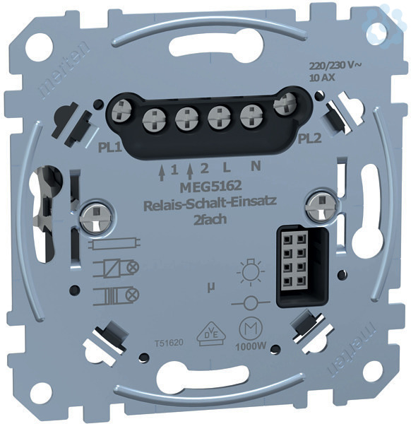 Für ohmsche, induktive und kapazitive Lasten wie Glühlampen, Energiesparlampen, NV-Halogenbeleuchtung mit konventionellem Trafo, elektronische Trafos, Leuchtstofflampen. Mit Krallen- und Schraubbefestigung. Mit Schraubklemmen. Funktionen: -Schalten von zwei Ausgängen. Es wird durch das Modul die Art und Weise festgelegt, wie die Funktion des Einsatzes genutzt wird. Externe Ansteuerung über zwei PlusLink Eingängexx Nennspannung: AC 220/230 V, 50/60 Hz. Nennstrom: max. 10 AX, cos Phi 0,6. Die Gesamtbelastung beider Kanäle darf 14 A nicht überschreiten. Ausgänge: 2xSchließer. Max. Schaltleistung pro Kanal: Glühlampen: 2200 W. HV-Halogenlampen: 2000 W. NV-Halogenlampen mit gewickeltem Trafo: 500 VA. Elektronische Trafos: 1050 W. Kapazitive Last: 10 A, 140 uF. Energiesparlampen: 100 VA. Motorlast: 1000 VA. Neutralleiter: erforderlich (3 Leitersystem). Anschlussquerschnitt: max. 2x2,5 mm². Zu komplettieren mit: Taster-Modul Basic, 1fach System M MEG5110-0300, System Design MEG5110-60xx Taster-Modul Basic, 2fach Sys