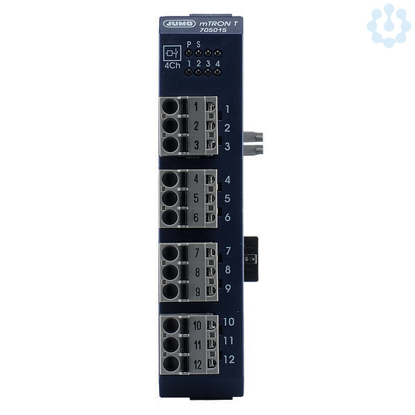 Das Relaismodul (4 Kanal für Hutschienenmontage, Komponente des Gesamtsystems mTRON T) stellt vier Relaisausgänge zur Verfügung, die über den Systembus durch Digitalsignale angesteuert werden (Zuordnung in der Verbindungsliste bzw. direkt von der SPS). Die Relaisausgänge sind mit jeweils einem Wechslerkontakt AC 230 V / 3 A ausgestattet. Das Anliegen der Spannungsversorgung, der Betriebszustand des Moduls, sowie die Zustände der Relaisausgänge werden durch Leuchtdioden angezeigt. Der Moduleinschub lässt sich im Servicefall einfach nach vorne aus dem Gehäuse ziehen. Das Gehäuse einschließlich Busplatine bleibt dabei auf der Hutschiene montiert. Die Spannungsversorgung beträgt DC 24 V +25/-20 %.