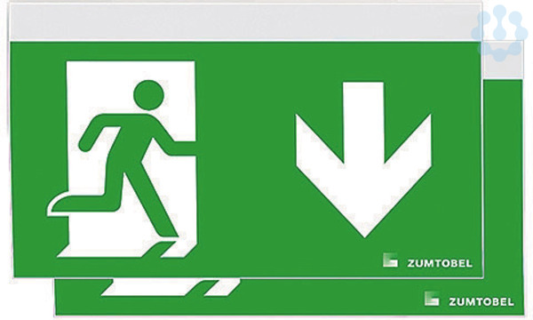 Sicherheitszeichen für COMSIGN 150 P MSC-WF/MRC-WF/MRCR-WF mit Aluminium Druckgussabdeckcover silber, pulverbeschichtet, zur einfachen Montage auf die PURESIGN/COMSIGN 150 P Gehäuse für Seilabhängung, max. Seilabhängung: 1,5 m, gleichmäßige Hinterleuchtung des Piktogramms, Leuchtdichte > 500 cd/m² im weißen Bereich, Piktogramm per Digitaldruck auf die Acrylglasplatte aufgebracht, Sicherheitszeichen gemäß ISO 7010: 2seitig, Symbol: Rettungsweg/Notausgang. Richtungspfeil nach unten, Erkennungsweite gemäß EN 1838: 30 m, Abmessung: 300 x 16 x 188 mm, Gewicht: 0,83 kg