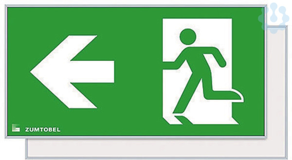 Sicherheitszeichen für PURESIGN 150 P MSC-WF/MRC-WF/MRCR-WF mit Aluminiumrahmen silber (RAL 7035 ähnlich), pulverbeschichtet, zur einfachen Montage auf die PURESIGN/COMSIGN 150 P Gehäuse für Seilabhängung, max. Seilabhängung: 1,5 m, gleichmäßige Hinterleuchtung des Piktogramms, Leuchtdichte > 500 cd/m² im weißen Bereich, Piktogramm per Digitaldruck auf die PC (Polycarbonat)- Scheibe aufgebracht, Sicherheitszeichen gemäß ISO 7010: 1seitig, Symbol: Rettungsweg/Notausgang. Richtungspfeil zur Seite, Erkennungsweite gemäß EN 1838: 30 m, Abmessung: 310 x 20 x 160 mm, Gewicht: 0,72 kg