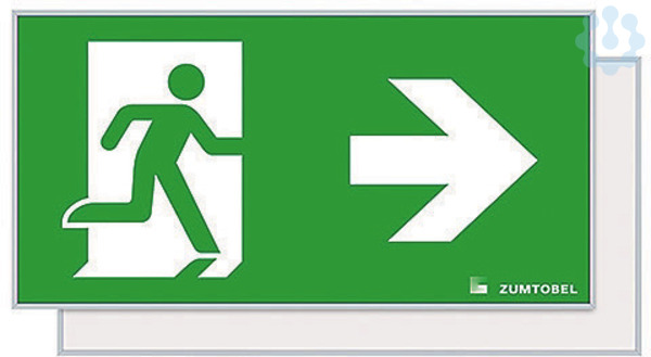Sicherheitszeichen für PURESIGN 150 P MSC-WF/MRC-WF/MRCR-WF mit Aluminiumrahmen silber (RAL 7035 ähnlich), pulverbeschichtet, zur einfachen Montage auf die PURESIGN/COMSIGN 150 P Gehäuse für Seilabhängung, max. Seilabhängung: 1,5 m, gleichmäßige Hinterleuchtung des Piktogramms, Leuchtdichte > 500 cd/m² im weißen Bereich, Piktogramm per Digitaldruck auf die PC (Polycarbonat)- Scheibe aufgebracht, Sicherheitszeichen gemäß ISO 7010: 1seitig, Symbol: Rettungsweg/Notausgang. Richtungspfeil zur Seite, Erkennungsweite gemäß EN 1838: 30 m, Abmessung: 310 x 20 x 160 mm, Gewicht: 0,72 kg