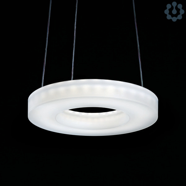 Direkt-indirekt strahlende Pendelleuchte. Das ringförmige, opale Leuchtengehäuse aus PMMA wird über ein beidseitig bestücktes LED-Board mittels hocheffizienter Mid-Power LEDs ausgeleuchtet. Die breitstrahlende Lichtverteilung erfolgt durch das opal eingefärbte Gehäuse. Das dreireihige LED-Board ist sowohl für monochrome (4000K und 3000K) als auch weißdynamische Anwendungen (TunableWhite von 2700-6500K) ausgelegt. Bei monochromer Bestückung besteht optional die Möglichkeit, den Direkt- und Indirektanteil getrennt voneinander zu dimmen. Farbige Akzente können mittels eingeschobener Farbfolien gesetzt werden. Die Leuchte wird über drei Transparentleitungen abgependelt, wobei eine dieser Leitungen als Sekundärleitung genutzt wird (Pendellänge 1,50m). Eine neue Generation magnetisch geschlossener Baldachine erlaubt ein klares Erscheinungsbild der Pendelleuchte ohne Sichtschrauben. Treiber schaltbar oder DALI-dimmbar.