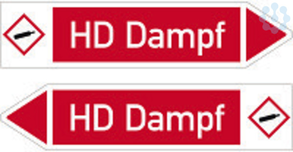Rohrleitungs-Einzeletikett HD Dampf, Fließrichtung rechts, mit Gefahrensymbol GHS04 (Komprimierte Gase), gemäß DIN 2403, für Rohre ab 90 mm Durchmesser, Gruppenfarbe: rot, Schrift: weiß, Material: selbstklebende Folie, temperaturbeständig von -40 bis +150°C, wasser-, öl- und laugenbeständig, kratz- und wischfest, Format: 100 x 440 mm, 1 Bogen = 2 Stück