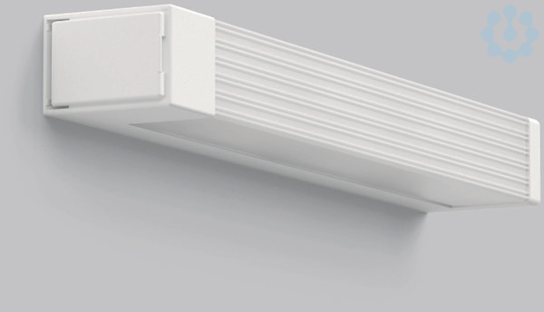 Linienleuchte als Wand- und Spiegelleuchte einsetzbar. Armatur Kunststoff. Endkappen Kunststoff. Mundgeblasenes Opalglas seidenglanz. Mit Schuko-Steckdose.