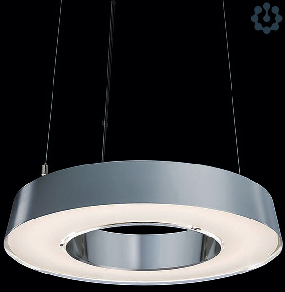 Direkt- indirektstrahlende Ringleuchte zur Pendelmontage mit rotationssymmetrischem Gehäuse aus hochglanzeloxiertem Aluminium. Die Deckenbefestigung erfolgt mittels Deckenbaldachin mit magnetisch gehaltener Abdeckung für ein klares Erscheinungsbild ohne sichtbare Verschraubung. Die unterseitige Entblendung der Mid-Power-LED auf Ringsegment-Leiterkarten erfolgt über eine eingeclipste opale Scheibe. Die Entblendung des Indirektanteils erfolgt über eine leicht mattierte Scheibe. Werkzeuglose Justierung der drei Stahlseilabhänger auf Leuchtenebene und transparente Anschlussleitung, Betriebsgerät im Baldachin integriert. Oberfläche des Leuchtengehäuses silber hochglänzend, Farbe des Baldachins ähnlich RAL 9016 Weiß feinstrukturiert. Farbwiedergabeindex min. Ra80, Lichtfarbe 830 (3000 Kelvin), 840 (4000 Kelvin) bzw. TW (Tunable White, 2700-6500 Kelvin). Schutzart IP20, Schutzklasse I.