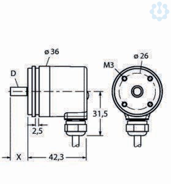 Absoluter Drehgeber - Singleturn, Industrial-Line, Synchroflansch, Ø 36mm, Vollwelle, Ø 6mm x 12,5mm mit Fläche, Magnetisches Messprinzip, Wellenmaterial: rostfreier Stahl, 15?30 VDC, Analogausgang, 0?10 V, Kabelanschluss, Schutzart IP 69K wellenseitig, ?40 ... +85°C, max. 6000 U / min