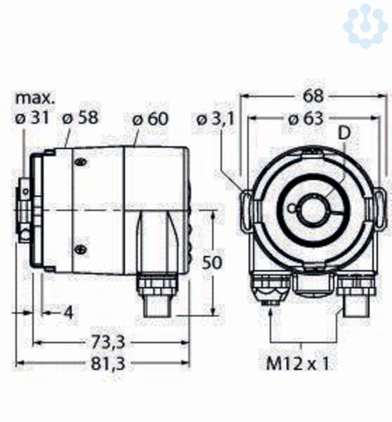Absoluter Drehgeber - Singleturn, Industrial-Line, Flansch mit Statorkupplung, Ø 58mm, Sackloch-Hohlwelle, Ø 12mm, Minimale Einstecktiefe 30mm, Optisches Messprinzip, Wellenmaterial: rostfreier Stahl, Profibus, Abnehmbare Bushaube mit Steckeranschluss (3 x M12), Schutzart IP 67 wellenseitig, ?40 ... +80°C, max. 3000 U / min