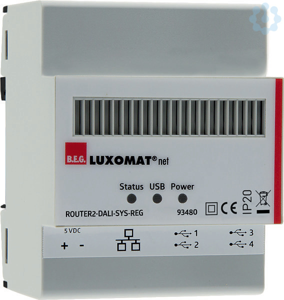 Router mit integriertem Web-Server und Applikations-Controller für die Hutschienenmontage nach DIN EN 60715, 4 USB-Anschlüsse für die Ansteuerung von bis zu 4 separat erhältlichen B.E.G. Applikations-Controller mit integriertem DALI-Netzteil, 1 LAN-Anschluss für die Vernetzung von bis zu 100 Geräten, bis zu 400 miteinander vernetzte DALI-Linien möglich, Zentrale Verwaltung von Parameter, Adressen, Gruppen und Szenen aller vernetzten DALI-Teilnehmer, Dezentrale Applikationslogik in Multisensoren und Tastern - Router übernimmt nur übergeordnete Funktionen, Benutzer- und Rechteverwaltung für unterschiedliche Rollen , DALI-Notleuchten Manager, Erweiterte Begleitlichtfunktion GUIDED LIGHT PLUS (DALI-Linien-übergreifend), Ereignis-Routingfunktion, um DALI-Linienübergreifende Beleuchtungszonen realisieren zu können, Update-Manager, für Aktualisierung der Router-Firmware über LAN/WAN, Bedienbar über kompatible Web-Browser beliebiger Endgeräte (Smartphone, Tablet, PC), Analyse- und Diagnosetools für Fehlersuche, Tempe