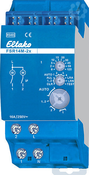 Stromstoß-Schaltrelais mit 2 Kanälen und Messung der Wirkleistung. 1+1 Schließer nicht potenzialfrei 16A/250V AC, 230V-LED-Lampen bis 600W, Glühlampen 2000W. Bidirektional. Stand-by-Verlust nur 0,1 Watt. Reiheneinbaugerät für Montage auf Tragschiene DIN-EN 60715 TH35. 2 Teilungseinheiten = 36mm breit, 58mm tief. Anschluss an den Eltako-RS485-Bus. Querverdrahtung Bus und Stromversorgung mit Steckbrücke. Die Momentanleistung wird für jeden Kanal getrennt gemessen und dem Bus übergeben - z.B. zur Weitergabe an einen externen Rechner - und auch über das FAM14 in das Funknetz gesendet. Der Maximalstrom als Summe über beide Kontakte beträgt 16A, es ist daher eine Absicherung an L mit maximal 16A erforderlich. Kontaktschaltung im Nulldurchgang zur Schonung der Kontakte und der Lampen. Beim Ausfall der Versorgungsspannung bleibt der Schaltzustand erhalten. Bei wiederkehrender Versorgungsspannung wird definiert ausgeschaltet. Die Kanäle können unabhängig voneinander als ES- und/oder ER-Kanal eingelernt werden. Szenen-