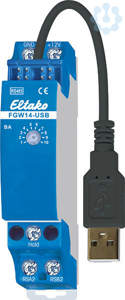 Gateway mit USB-A-Anschluss. Bidirektional. Stand-by-Verlust nur 0,3 Watt. Reiheneinbaugerät für Montage auf Tragschiene DIN-EN 60715 TH35. 1 Teilungseinheit = 18mm breit, 58mm tief. Das Gateway ist nur 1 TE breit, jedoch mehrfach verwendbar: Zum Anschluss eines Professional Smart Home Controllers SafeIV oder eines PCs über eine USB-Schnittstelle, zum Einkoppeln von bis zu drei FEM, zur Verbindung mit den Bus-Komponenten der älteren Baureihe 12 oder als Busverbinder von zwei RS485-Bussen der Baureihe 14. Anschluss an den Eltako-RS485-Bus. Querverdrahtung Bus und Stromversorgung mit Steckbrücke. Betrieb in Verbindung mit FAM14 oder FTS14KS. Die Hold-Klemme wird mit dem FAM14 oder FTS14KS verbunden. Die PC-Verbindung erfolgt über eine USB-Schnittstelle mit 9600 Baud oder 58k Baud. Funk-Empfangsmodule FEM werden parallel an die Sub-Bus-Klemmen RSA2 und RSB2 sowie die Stromversorgungs-Klemmen GND und +12V angeschlossen. Bis zu 10 Taster-Eingabemodule FTS12EM werden ggf. in Reihe an die Sub-Bus-Klemmen RSA2 und RS