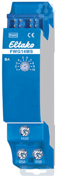 Wetterdaten-Gateway für Multisensor MS. Bidirektional. Stand-by-Verlust nur 0,3 Watt. Reiheneinbaugerät für Montage auf Tragschiene DIN-EN 60715 TH35. 1 Teilungseinheit = 18mm breit, 58mm tief. An das Gateway wird ein Multisensor MS an die Klemmen RSA und RSB angeschlossen. Dessen Informationen werden einmal pro Sekunde empfangen und in Bus-Telegramme umgewandelt. An ein FWG14MS kann nur 1 Multisensor MS angeschlossen werden. Es können jedoch mehrere FWG14MS an einen Multisensor MS angeschlossen werden, um z.B. mehrere Eltako-RS485-Busse mit nur einem Multisensor MS anzusteuern. Nur bei einem FWG14MS muss der außenliegende Abschusswiderstand vorhanden sein. Bei weiteren FWG14MS muss er dagegen entfernt werden. Anschluss an den Eltako-RS485-Bus. Querverdrahtung Bus und Stromversorgung mit Steckbrücke. Betrieb in Verbindung mit FAM14 oder FTS14KS. Die Hold-Klemme wird mit dem FAM14 oder FTS14KS verbunden. Bis zu zwei FWG14MS können in einem Bus betrieben werden. Mit dem Telegramm-Duplizierer FTD14 können die Te