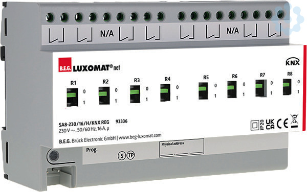 Schaltaktor zum Schalten von Verbrauchern, KNX-Reiheneinbaugerät der Breite 4 TE (SA4 - 230 / 16 /) oder 8 TE (SA8 - 230 / 16 /) zur Montage auf einer Hutschiene (TH 35 nach EN 60715) zum Einbau in den Verteiler, Das Gerät verfügt über 4 (SA4 - 230 / 16 /) oder 8 (SA8 - 230 / 16 /) unabhängige, potentialfreie Schließerkontakte., Schaltkontakte sind optimiert für kapazitive Lasten, Handschalter ermöglichen das manuelle Schalten auch ohne Busspannung, Der Schaltaktor wird vom KNX-Bus versorgt und benötigt keine zusätzliche Spannungsversorgung, Der Anschluss der Ausgänge erfolgt über Schraubklemmen