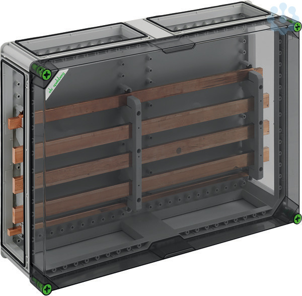 Sammelschienengehäuse mit zusätzlichem Anschlussraum, Industrie Qualität, Sammelschienensystem, 5-polig, ohne Klemmen, zur individuellen Bestückung, mit transparentem Deckel, 4 x Gehäuseverbinder (GGV), mit Sammelschienensystem 5-polig 630A, mit CU-Schienen, L1...L3: 30 x 10mm, N: 25 x 10mm, PE: 12 x 10mm