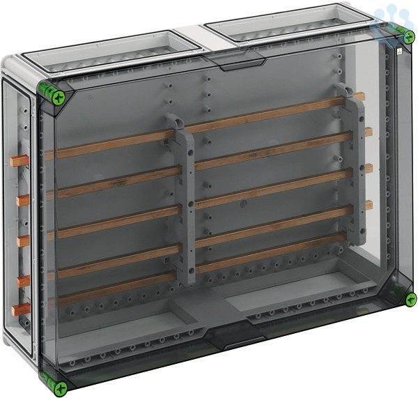 Sammelschienengehäuse mit zusätzlichem Anschlussraum, Industrie Qualität, Sammelschienensystem, 5-polig, ohne Klemmen, zur individuellen Bestückung, mit transparentem Deckel, 4 x Gehäuseverbinder (GGV), mit Sammelschienensystem 5-polig 250A, mit CU-Schienen, L1...L3: 12 x 10mm, N: 12 x 10mm, PE: 12 x 10mm
