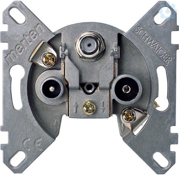 Sat-Einzelanschlussdose 3fach. Für Stichleitungs- und Sternverteilsysteme in GA- und Sat-Hausverteilanlagen. Mit Gleichspannungsdurchlass über den Sat-Anschluss. Passend für UP-Dosen Durchm. 55-65 mm. Mit Krallen- und Schraubbefestigung. Gleichspannungsdurchlass max. 24 V/320 mA. Signal 22 kHz- und DiSEqC. Zu komplettieren mit Zentralplatte für Antennensteckdosen System M 2967xx, 2975xx, System Design MEG4123-60xx, System Fläche 2941xx.