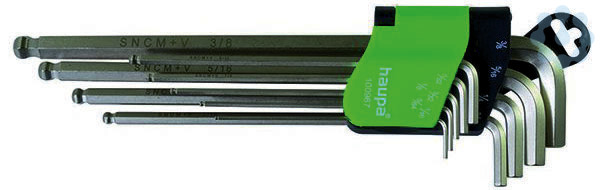 Sechskant-Winkelschraubendrehersatz mit Kugelkopf, extra langaus Chrom-Vanadium-Stahl, durchgehend gehärtet, vernickelt, extra lang, metrisch oder AF, mit Kugelkopf, im aufklappbaren Halter.