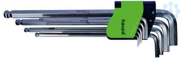 Sechskant-Winkelschraubendrehersatz mit Kugelkopf, extra langaus Chrom-Vanadium-Stahl, durchgehend gehärtet, vernickelt, extra lang, metrisch oder AF, mit Kugelkopf, im aufklappbaren Halter.