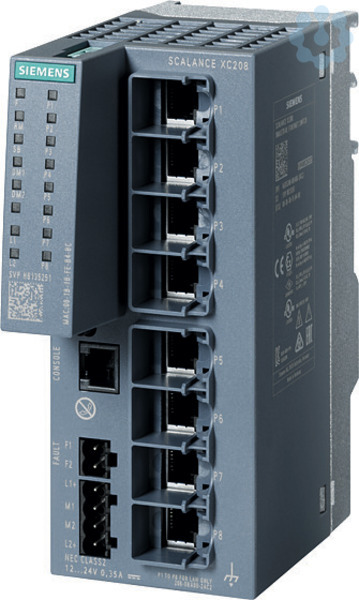 SCALANCE XC208 managebarer Layer 2 IE Switch. IEC 62443-4-2 zertifiziert. 8x 10/100 Mbit/s RJ45-Ports. 1x Konsolen-Port. Diagnose-LED. redundante Spannungsversorgung. Temp.-Bereich-40°C bis +70°C. Montage: Hut-/S7-Profilschiene/Wand Redundanzfunktionen Office Features (RSTP, VLAN ,...). PROFINET IO-Device Ethernet/IP-konform C-PLUG Schacht. SCALANCE XC208 Managed, Layer 2 Kompakt Switch, 8x 10/100 Mbit/s RJ45 für für Industrial Ethernet (PROFINET- und EtherNet/IP)Einsetzbar in unterschiedlichsten Umgebungen: Maschinenbau, Automobilbranche, Nahrungs- und Genussmittelindustrie, entlang Schienen-geführter Strecken oder in der Öl- und Gasindustrie.Hohe Betriebssicherheit in industrieller Umgebung durch robustes Gehäuse und robuste Teilnehmeranschlüsse, Redundanz und erweiterter Temperaturbereich. Erhöhte Anlagenverfügbarkeit durch redundante Spannungseinspeisung und Netzwerkstrukturen auf Basis von HRP und MRP, Standby-Redundanz zwischen HRP-Ringen, Verhindern von Loops durch STP, RSTP und MSTP sowie Loop Detecti