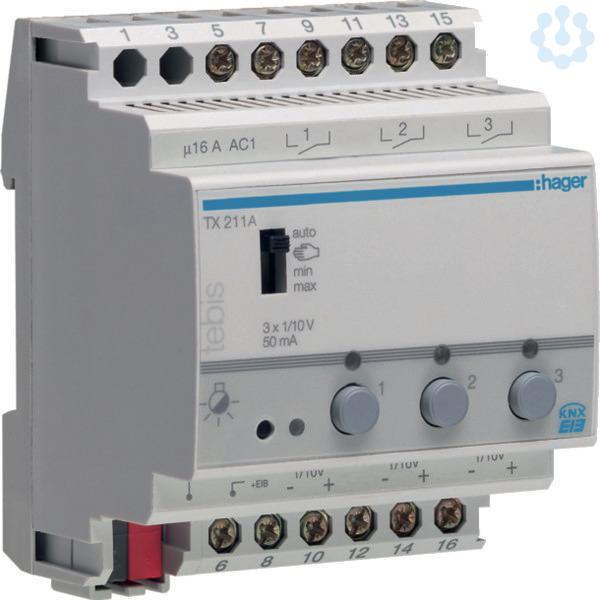 Schalt-/Dimmaktor 3-fach KNX, 1-10V. Schalt-/Dimmaktor um Dimmen von Beleuchtungskreisen über Ferndimmer und elektronische Vorschaltgeräte mit 1-10V-Schnittstelle. Je Kanal können die gesteuerten Geräte über einen potenzialfreien Schließerkontakt bei AUS spannungsfrei geschaltet werden. Integriert ist eine Beleuchtungsszenensteuerung für 8 Szenen mit voreinstellbaren Helligkeitswerten. Dimmgeschwindigkeit, Helligkeit beim Einschalten und Verhalten nach Spannungs- oder Busausfall ist einstellbar. Der Schaltzustand der Ausgänge wird über eigene Rückmeldeobjekte auf den Bus gesendet. Das Gerät ist zusätzlich mit einer vom Bus unabhängigen und nicht übersteuerbaren Handbedienung und LED-Schaltzustandsanzeigen ausgestattet.