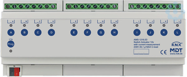 KNX Schaltaktor 12-fach, 12TE, REG, 16 A, 230 V AC, C-Last, Standard, 140 µF, mit Strommessung. Standardausführung mit bistabilen Relais Strom max. 16 A, kapazitive Last max. 140 µF.