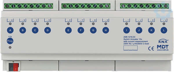 KNX Schaltaktor 12-fach, 12TE, REG, 16/20 A, 230 V AC, C-Last, Industrie, 200 µF, mit Strommessung. Industrieausführung mit bistabilen Relais Strom max. 16/20 A, kapazitive Last max. 200 µF. Umfangreiche Funktionserweiterung. Integrierte True RMS Strommessung.