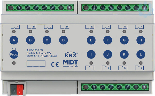 Schaltaktor 12-fach, 8TE, REG, 16A, 230VAC, C-Last, Standard, 140µF. Standardausführung mit bistabilen Relais Strom max. 16A, kapazitive Last max. 140µF. Platzsparend durch optimalen Formfaktor. Umfangreiche Funktionserweiterung. Handbetrieb sperrbar und LED Anzeige je Kanal. Schließer- und Öffnerbetrieb. Statusmeldung bei manueller Betätigung. Zeitfunktionen (Ein-/Ausschaltverzögerung, Treppenlichtfunktion). Erweiterte Logik und Szenenfunktionen je Kanal. Erweiterte Statusfunktionen (invertiert, zyklisch, bei Sperre). Schwellwertschalter (Byte/2Byte/2Byte float). Betriebsstundenzähler für Schalten. Priorität/Zwangsführung mit automatischer Rückfallzeit. Alle L- Anschlüsse getrennt. Versorgungsspannung über KNX Bus. Schneller Download der Applikation (long frame support für ETS5). 3 Jahre Produktgarantie.