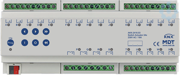 Schaltaktor 24-fach, 12TE, REG, 16A, 230VAC, Kompakt, 70µF, 10EVG. Kompakte Ausführung mit bistabilen Relais Strom max. 16A bei ohmscher Last, 70µF/10EVG. Funktionserweiterung. Handbetrieb sperrbar und LED Anzeige je Kanal. Schließer- und Öffnerbetrieb. Statusmeldung bei manueller Betätigung. Zeitfunktionen (Ein-/Ausschaltverzögerung). Umfangreiche Treppenlicht- und Impulsfunktionen. Rückmeldefunktion (aktiv/passiv) für alle Kanäle. Logische Verknüpfungen. Erweiterte Szenenfunktionen je Kanal. Zentralfunktionen und Sperrobjekte zur Zwangsführung. Einstellbares Verhalten bei Busspannungsausfall/-wiederkehr. Alle L- Anschlüsse getrennt. Versorgungsspannung über KNX Bus. Schneller Download der Applikation (long frame support für ETS5). 4mm² Anschlußklemmen. 3 Jahre Produktgarantie.