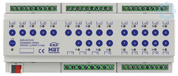 Schaltaktor 24-fach, 12TE, REG, 16A, 230VAC, C-Last, Standard, 140µF. Standardausführung mit bistabilen Relais Strom max. 16A, kapazitive Last max. 140µF. Platzsparend durch optimalen Formfaktor. Spart bis zu 30% Platz im Schaltschrank. Umfangreiche Funktionserweiterung. Handbetrieb sperrbar und LED Anzeige je Kanal. Schließer- und Öffnerbetrieb. Statusmeldung bei manueller Betätigung. Zeitfunktionen (Ein-/Ausschaltverzögerung, Treppenlichtfunktion). Erweiterte Logik und Szenenfunktionen je Kanal. Erweiterte Statusfunktionen (invertiert, zyklisch, bei Sperre). Schwellwertschalter (Byte/2Byte/2Byte float). Betriebsstundenzähler für Schalten. Priorität/Zwangsführung mit automatischer Rückfallzeit. Alle L- Anschlüsse getrennt. Versorgungsspannung über KNX Bus. Schneller Download der Applikation (long frame support für ETS5). 3 Jahre Produktgarantie.