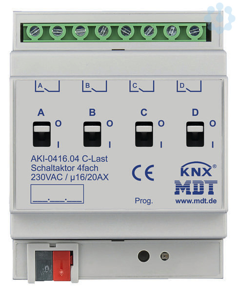 Schaltaktor 4-fach, 4TE, REG, 16/20A, 230VAC, C-Last, Industrie, 200µF. Industrieausführung mit bistabilen Relais Strom max. 16/20A, kapazitive Last max. 200µF. Umfangreiche Applikation. Mechanische Handbedienung zur direkten Betätigung des Relaiskontaktes. Status sichtbar. Schließer- und Öffnerbetrieb. Zeitfunktionen (Ein-/Ausschaltverzögerung). Umfangreiche Treppenlicht- und Impulsfunktion. Erweiterte Logik und Szenenfunktionen je Kanal. Erweiterte Statusfunktionen (invertiert, zyklisch, bei Sperre). Schwellwertschalter (Byte/2Byte/2Byte float). Betriebsstundenzähler für Schalten. Priorität/Zwangsführung mit automatischer Rückfallzeit. Alle L- Anschlüsse getrennt. Versorgungsspannung über KNX Bus. Schneller Download der Applikation (long frame support für ETS5). 3 Jahre Produktgarantie.