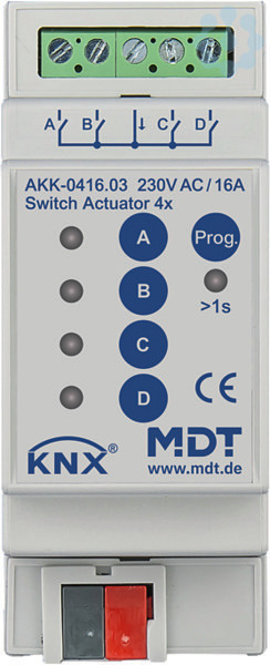 Schaltaktor 4-fach, 2TE, REG, 16A, 230VAC, Kompakt, 70µF, 10EVG. Kompakte Ausführung mit bistabilen Relais Strom max. 16A bei ohmscher Last, 70µF/10EVG. Funktionserweiterung. Taster für Handbetrieb und LED Anzeige je Kanal. Schließer- und Öffnerbetrieb. Statusmeldung bei manueller Betätigung. Zeitfunktionen (Ein-/Ausschaltverzögerung). Umfangreiche Treppenlicht- und Impulsfunktionen. Rückmeldefunktion (auch bei manueller Betätigung) für alle Kanäle. Logische Verknüpfungen. Erweiterte Szenenfunktionen je Kanal. Zentralfunktionen und Sperrobjekte zur Zwangsführung. Einstellbares Verhalten bei Busspannungsausfall/-wiederkehr. Gemeinsamer L- Anschluß. Versorgungsspannung über KNX Bus. Schneller Download der Applikation (long frame support für ETS5). 3 Jahre Produktgarantie.