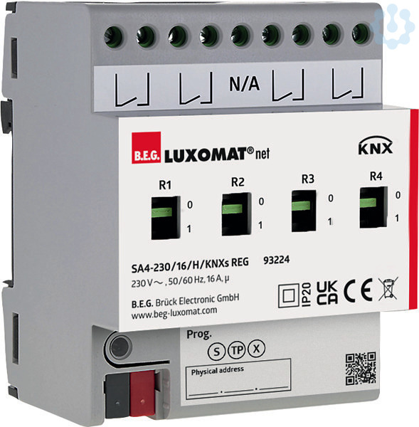 Schaltaktor zum Schalten von Verbrauchern, KNX Secure fähig, Industriequalität, KNX-Reiheneinbaugerät zur Montage auf einer Hutschiene (TH 35 nach EN 60715) zum Einbau in den Verteiler, Das Gerät verfügt über 4 unabhängige, potentialfreie Schließerkontakte, Schaltkontakte sind optimiert für kapazitive Lasten, Handschalter ermöglichen das manuelle Schalten auch ohne Busspannung, Versorgungsspannung über KNX-Bus, Anschluss der Ausgänge über Schraubklemmen