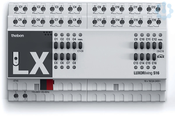 Schaltaktor mit Relaisausgängen für 16 Schaltkanäle für das Smart Home System LUXORliving, LED Schaltzustandsanzeige für jeden Kanal, Handschalter mit Statusanzeige (auch ohne Busspannung), Kontaktart (Öffner/Schließer) und Teilnahme an Zentralbefehlen wie Dauer-Ein und Zentral-Schalten, Schaltfunktionen: Ein/Aus, Treppenlicht mit Vorwarnen, Rückmelde-Objekt für jeden Kanal, Zentral-Objekte mit und ohne Priorität