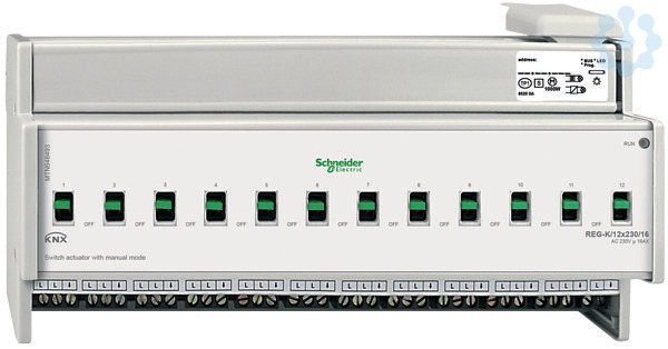 Schneider Electric KNX. Zum unabhängigen Schalten von 12 Verbrauchern über Schließerkontakte. Alle 230 V-Schaltausgänge lassen sich mit Handschaltern manuell betätigen. Mit integriertem Busankoppler, Der Netzanschluss erfolgt über Schraubklemmen, wobei je zwei der L-Anschlüsse intern gebrückt sind. Eine grüne LED zeigt nach dem Laden der Applikation die Betriebsbereitschaft an. Für die Montage auf Hutschienen TH35 nach EN 60715. Der Busanschluss erfolgt über eine Busanschlussklemme, eine Datenschiene ist nicht erforderlich, Nennspannung: AC 230 V, 50-60 Hz Je Schaltkontakt:. Schaltstrom: 16 A, cos Phi 0,6 AC1-Betrieb: max 16 A AC3-Betrieb: max 10 A AC5-Betrieb: max 16 A Max Gleichstrom: 16 A/ 24V DC, Lebenserwartung Ausgang: mechanisch: >106 AC1/AC3/AC5-Betrieb: >3x104. 230V, 1A ohmsch: >8x105. Glühlampen: AC 230 V, max. 3600 W. Halogenlampen: AC 230 V, max 2500 W Leuchtstofflampen: AC 230 V, max 2500 VA. Kapazitive Last: AC 230 V, 16 A, ma 200 uF Minimale Schaltleistung: 100 mA/12V AC/DC Maximaler Einschalts