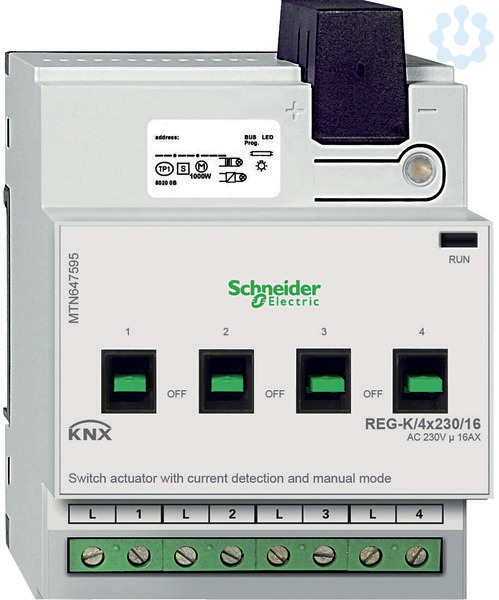 Schneider Electric KNX. Zum unabhängigen Schalten von 4 Verbrauchern über Schließerkontakte. Der Aktor verfügt über eine integrierte Stromerkennung, die den Lastrom je Kanal misst. Alle 230 V-Schaltausgänge lassen sich mit Handschaltern manuell betätigen. Mit integriertem Busankoppler. Eine grüne LED zeigt nach dem Laden der Applikation die Betriebsbereitschaft an. Der Lastanschluss erfolgt über Schraubklemmen. Für die Montage auf Hutschienen TH35 nach EN 60715. Der Busanschluss erfolgt über eine Busanschlussklemme. Nennspannung: AC 230 V, 50-60 Hz. DC 12-24 V +/-10%, 0,1-16 A, Je Schaltkontakt: Schaltstrom: 16 A, cos Phi 0,6. Erfassungsgenauigkeit: +/- 8% des aktuellen Stromwertes (sinus) und +/- 100 mA. Frequenz: 50/60 Hz bei Wechselspannung. Darstellung: 100 mA. Gerätebreite: 4 TE entspricht ca 216 mm, Lieferumfang: Mit Busanschlussklemme und Leitungsabdeckung.
