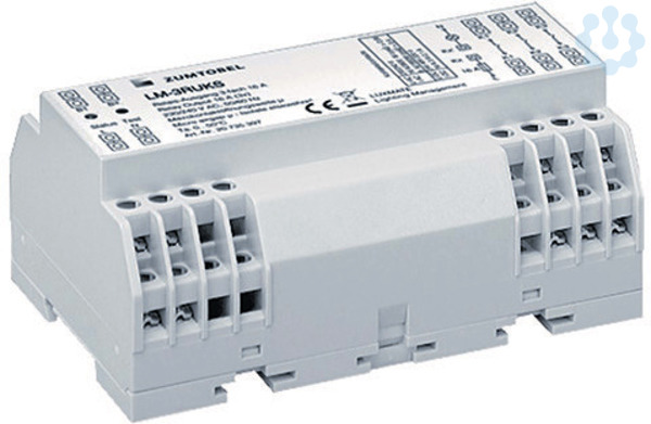 Relais-Ausgangsgerät mit 3 Relaiskontakten zum Schalten von Lampen für Netzspannungen bis 230/240V. Belastung je Kontakt bis zu 16A (bei cosphi=1) möglich. Ausgangsseitig: drei voneinander unabhängig adressierbare / ansteuerbare Ausgänge mit je einer Zwei-Draht-Steuerleitung. Netz- und Busanschluss. Anschlüsse erfolgen über Schraubklemmen, Test-Taster, Status-LED, Schaltschrankgehäuse aus flammwidrigen Polycarbonat, halogenfrei geeignet für Montage auf Hutschiene 35mm Gemäss EN 50022, zulässige Umgebungstemperatur von 0 bis +50°C, Schutzart IP20, Abmessungen: 140 x 90 x 59mm, 8 TE je 17,5mm.