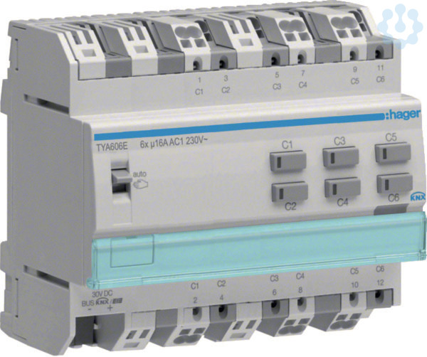 Schaltaktor 6-fach KNX, 16A, C-Last, mit Stromerkennung. Schaltausgang zum Schalten von 6 Steckdosen-/Beleuchtungsausgängen oder 3 Jalousien. Zur Steuerung von Beleuchtungsausgängen kann zwischen EIN/AUS, Zeitschaltung, Sicherheits-Aus, Zwangssteuerung, Sperr-, Logik-, Preset-, Verzögerungsfunktion oder 64 Szenenfunktion pro Kanal ausgewählt werden. Mit Umschaltfunktion für Zeit oder Dauerfunktion. Mit Stromflusserkennung zur Visualisierung des Stromsflusses und Überwachung des von Stromverbrauchsschwellen mit Fehlererkennungsfunktion. Über die Jalousiefunktion kann der Fahrbefehl AUF/AB/Stopp und der Lamellenwinkel verstellt werden. Prozentansteuerung der Jalousie zum Fahren einer vordefinierten Position. Mit der Sonnenschutzfunktion kann in Verbindung mit einem Außensensor die Helligkeit pro Raum gesteuert werden. Mit Alarmfunktion zur Steuerung der Jalousie in eine definierte Position. Sicherheitsabfahrt solange die Taste gedrückt bleibt. 64 Szenenfunktion pro Kanal. Logikblock zur Steuerung des Ausgangs i